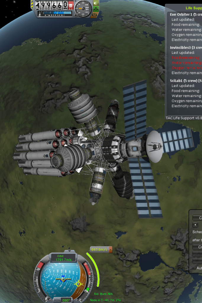 GLaDOS used a number of different mods, but the most important mods were Kethane, TAC Luife Support, and MechJeb 2. At this time with KSP, they had not yet developed ISRU, so Kethane was a practical way to refuel vessels. You could scan for sub-surface Kethane deposits, mine it, process it into fuels, and refuel your vessel. It just required some strange piping (specifically, going from the destination tank into the refiner). The MechJeb mod made tedious maneuvers easy by fully automating them. Ascent trajectories, auto-staging, Hohmann transfers, docking maneuvers, landing trajectories – it handled it all. As someone who grew up with Star Wars and Star Trek, and played games like TIE Fighter and Descent Freespace, orbital mechanics was a very strange concept and threatened to detract from the fun of the game. So, rather than struggling to figure it out, I let the mod take care of it. This allowed me to figure out other things, such as how to get to other planets and the delta-V requirements to escape the atmosphere of Kerbin. Thunder Aerospace Corporation Life Support was used to add some element of realism and additional challenge to the game. If insufficient life support resources were available, the Kerbals on the mission would die.